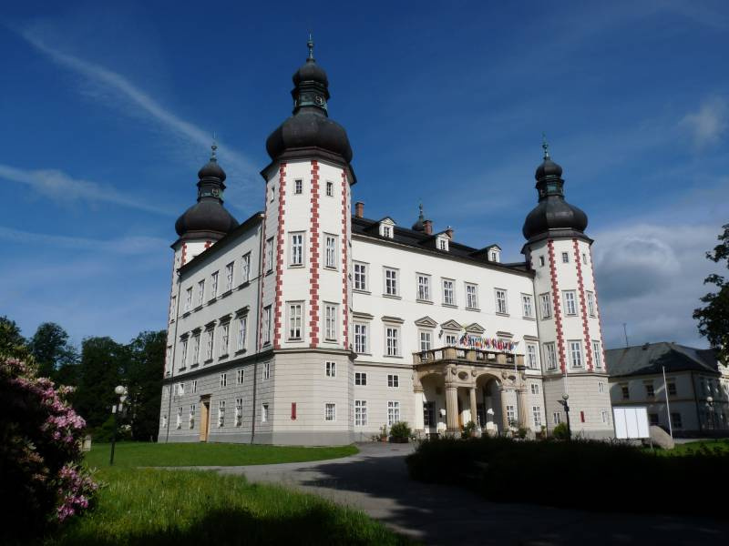 Zhlédnout zde můžete vstupní halu s dveřmi zdobenými intarzovanými motivy a obrazy čtyř krkonošských medvědů, ulovených na Vrchlabském panství.