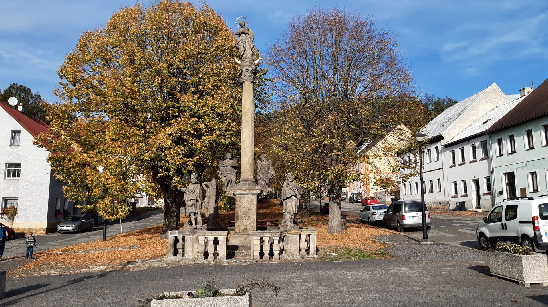 Před informačním centrem na Náměstí 5. května stojí morový sloup. Sloup byl postaven v roce 1682 na počest vyhnutí se morové epidemii roku 1680. Autorem je K. Steyer. V roce 1726 byla doplněna balustráda a sochy (sv. Jan Nepomucký, sv. Florián, sv. Šebestián a sv. Prokop).